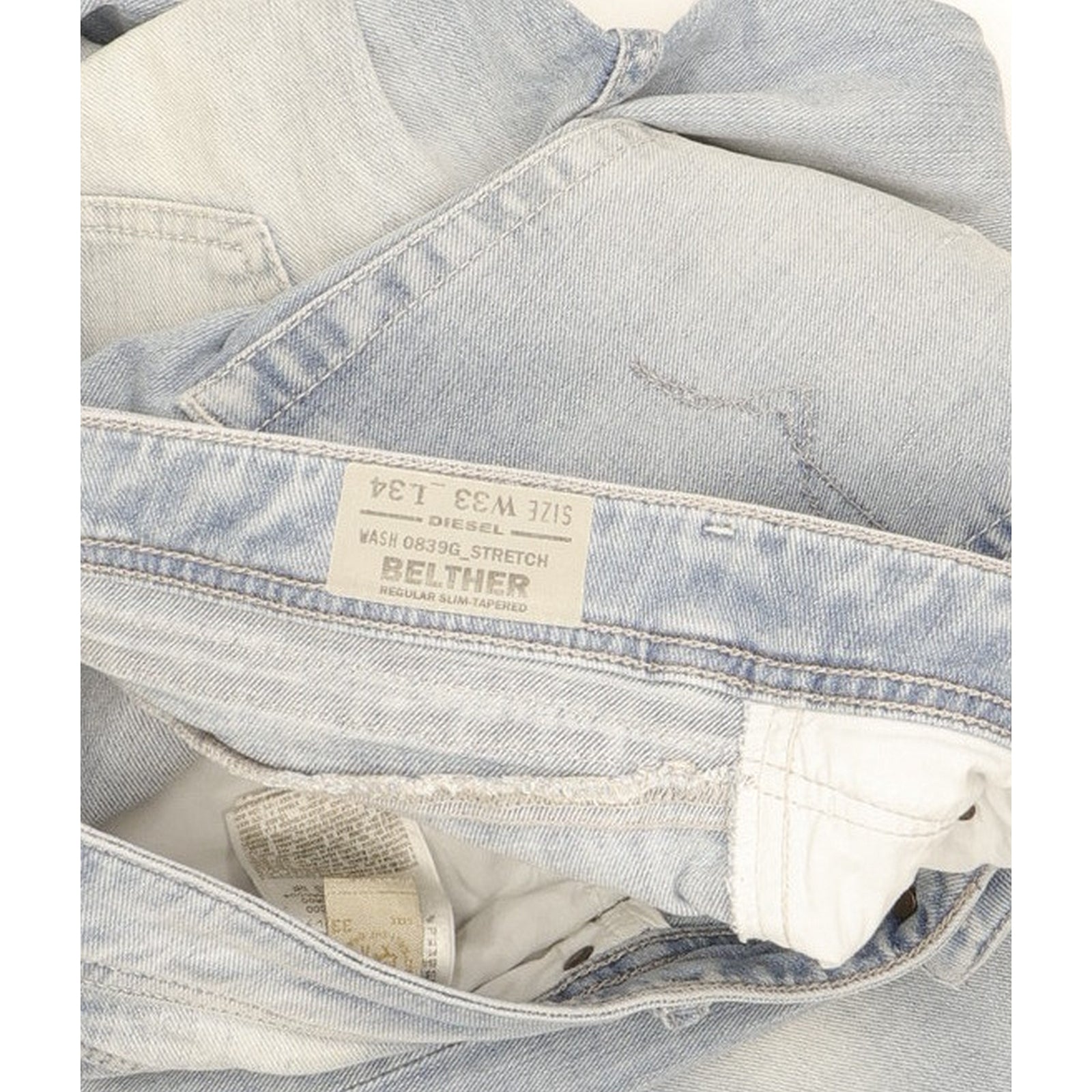 Diesel Belther Tapered Slim Jeans in Very good used condition please note the actual inside leg measurement is 33", please see photos. Jeans are made from 98% Cotton, 2% Elastane, they are in Blue colour and with a Button Fly. When considering a correct fit please refer to the actual measurements provided, as jeans often differ from the labeled size due to wear and washing. We have measured the jeans and the actual measurements are: Waist measures 33 inches, Inside leg measures 33 inches, we also measured Hems: 7 inches and Rise: 10 inches. If you have any questions or need additional information, feel free to contact us—we’re happy to help!