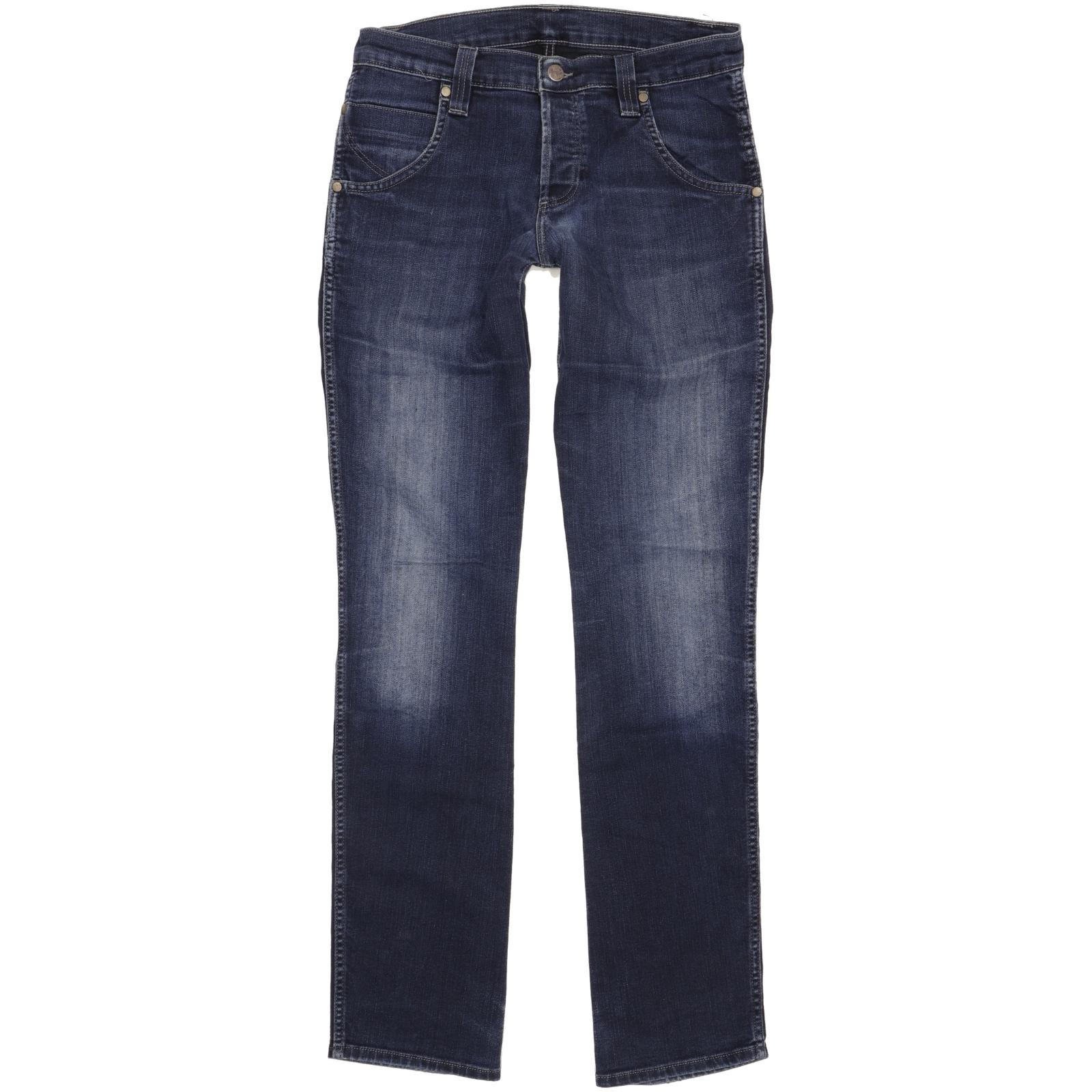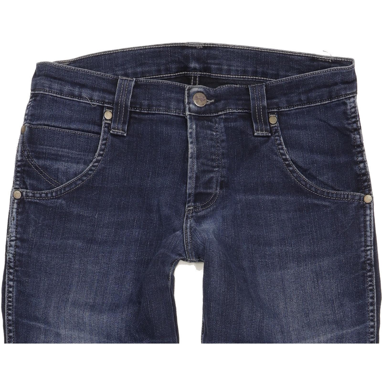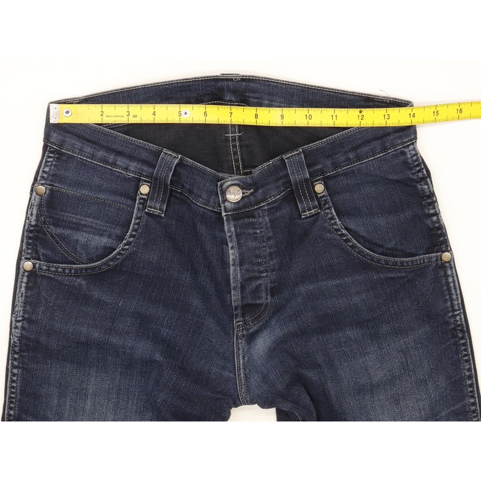 Wrangler Spencer Straight Slim Jeans in Good used condition Please note the actual measurement is W28" L33", please see photos. Jeans are made from 74% Cotton, 26% Polyester, they are in Blue colour and with a Button Fly. When considering a correct fit please refer to the Actual measured size as it is common for jeans to change size over time and differ from the label size. We have measured the jeans and the actual measurement are: Waist measure 28 inch, Inside leg measured 33 inch, we also measured Hems: 7 inch and Rise: 9 inch. If you need information or have any question, please Contact Us and we will do our best to help you.